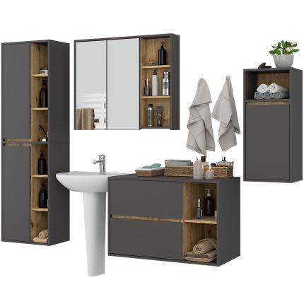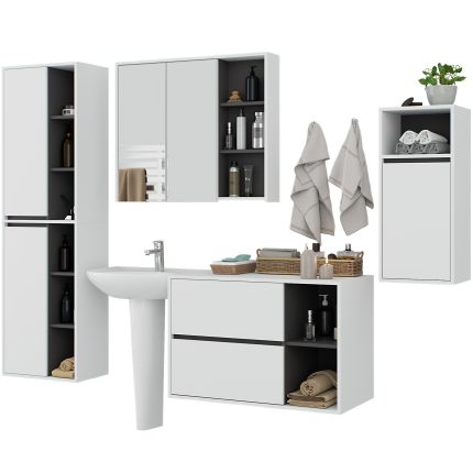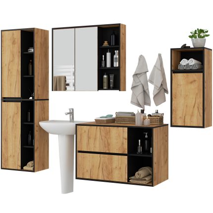 Zestaw mebli łazienkowych VAMI to kwintesencja nowoczesnego stylu. Dzięki otwartym półkom, szafki są lekkie wizualnie i perfekcyjnie wpisują się w najnowsze