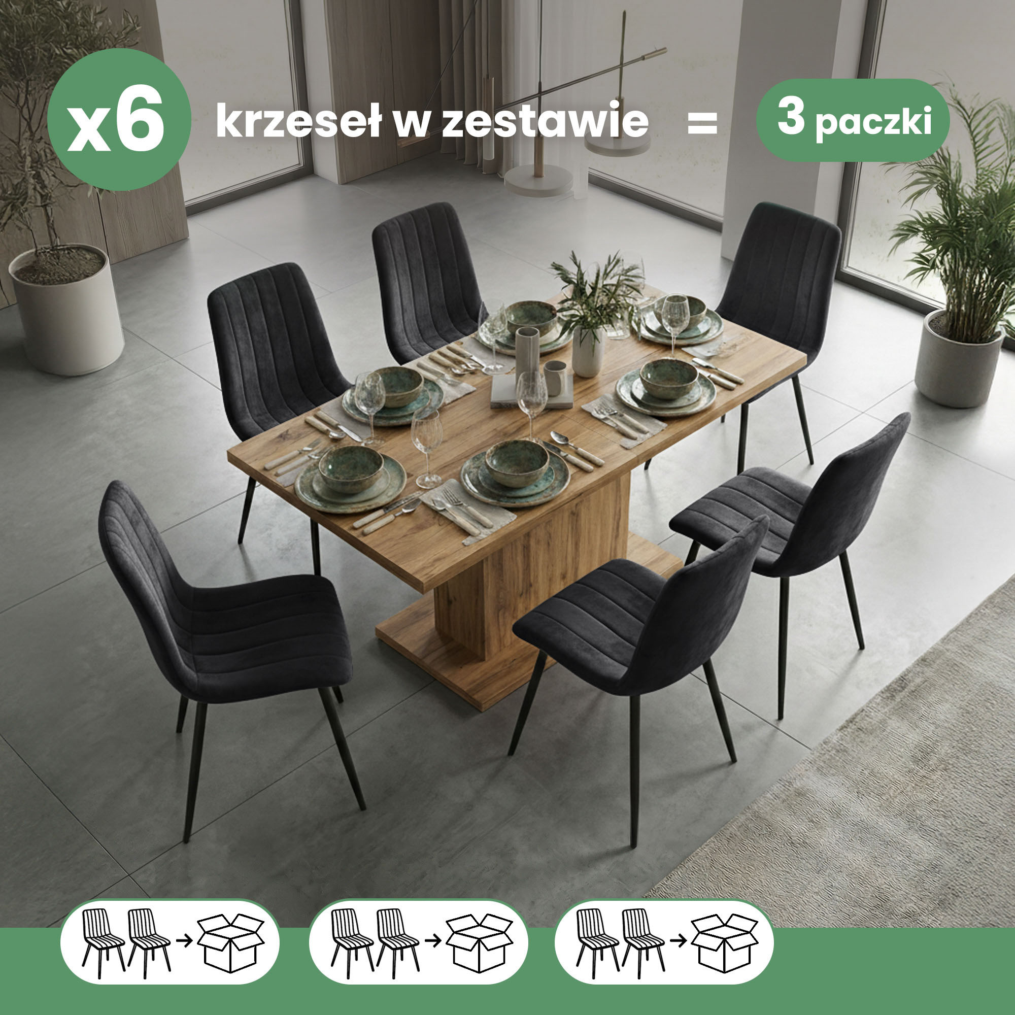 6x Welurowe krzesło tapicerowane pikowane Ciemny Grafit LIVO Czarne nogi