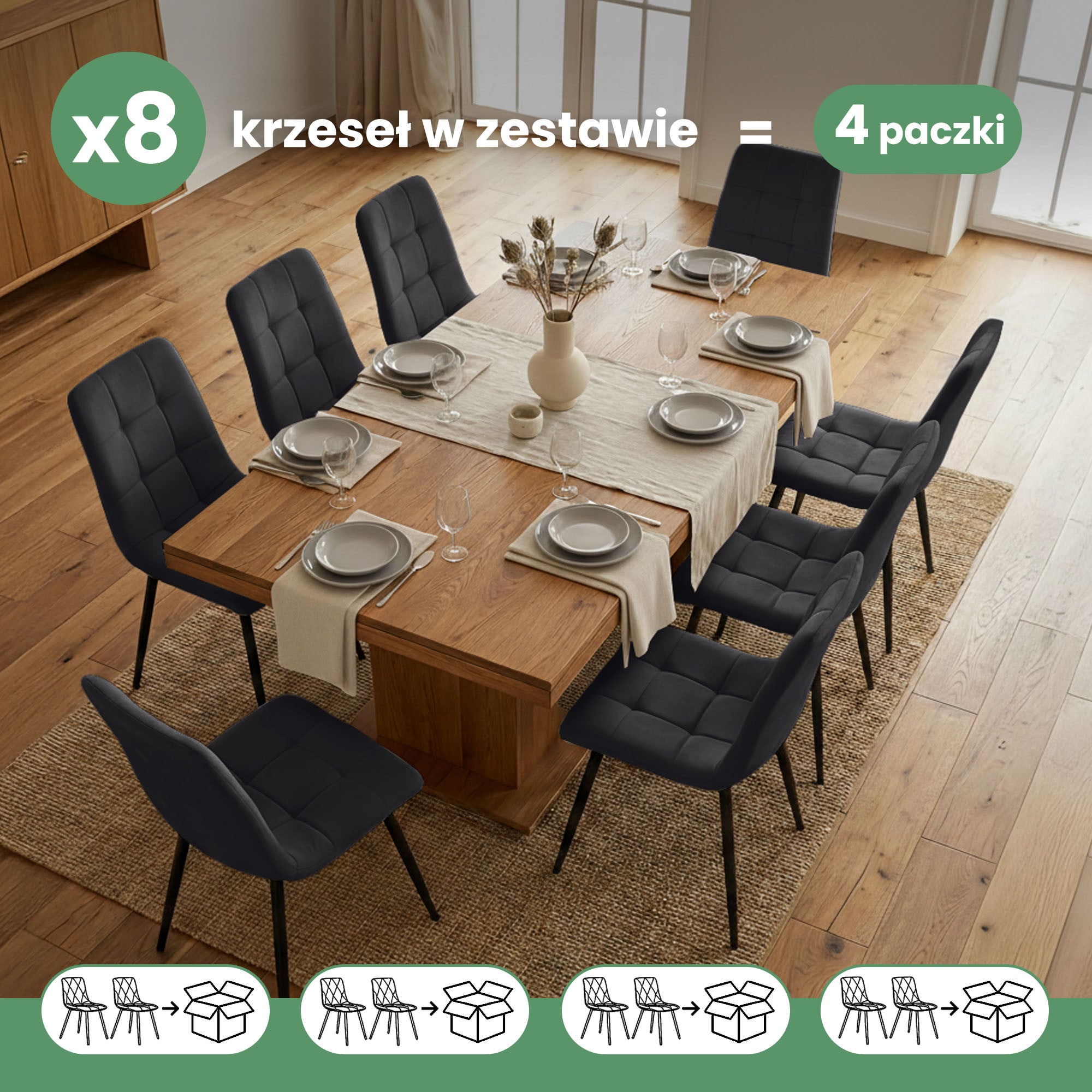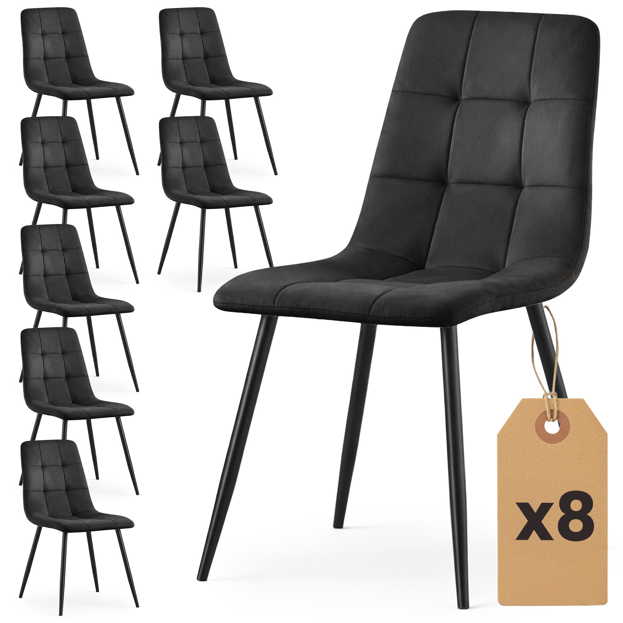 8x Welurowe krzesło tapicerowane pikowane Czarne NERO Czarne nogi