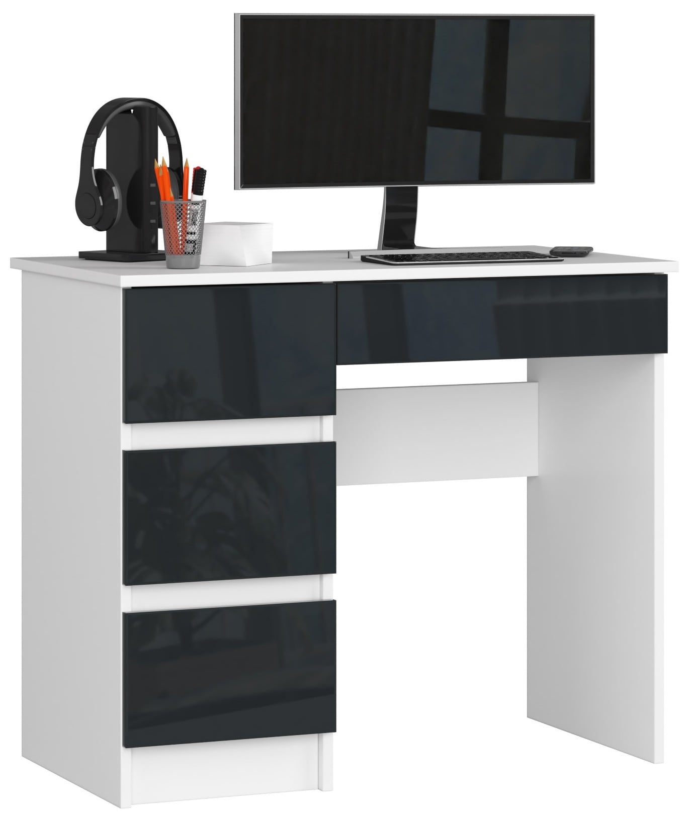 Minimalistyczne biurko A-7 90 cm. (lewe) w uniwersalnej tonacji, którego grafitowe fronty charakteryzują się wysokim połyskiem, to produkt, do którego można dopasować inne elementy wyposażenia pochodzącej z tej samej kolekcji – pojemne szafy, funkcjonalne regały oraz różnej wielkości komody.