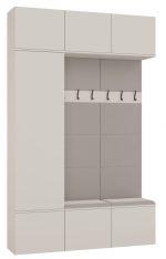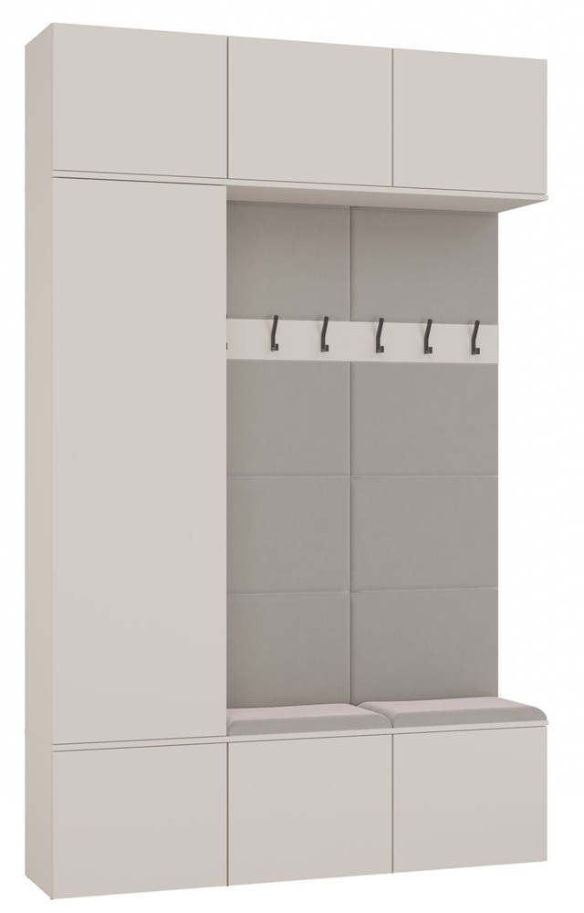 Zestaw HAGA III 1SZ2W to propozycja dla tych, którzy potrzebują więcej przestrzeni do przechowywania, nie rezygnując z nowoczesnego wyglądu. To gotowe, kompletne rozwiązanie do przedpokoju, łączące pojemny moduł szafy z drążkiem i półkami oraz 2 moduły z wieszakiem, tapicerowanym siedziskiem i szafkami.