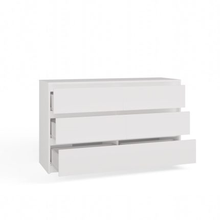 Komoda ALMA to elegancki i funkcjonalny mebel, który świetnie sprawdzi się w różnych pomieszczeniach — od przedpokoju, przez salon i sypialnię, aż po pokój dziecka czy domowe biuro. Jej minimalistyczna forma i klasyczny biały kolor pasują do wielu stylów wnętrzarskich, a bezuchwytowe fronty z systemem TIP-ON dodają nowoczesnego charakteru.