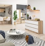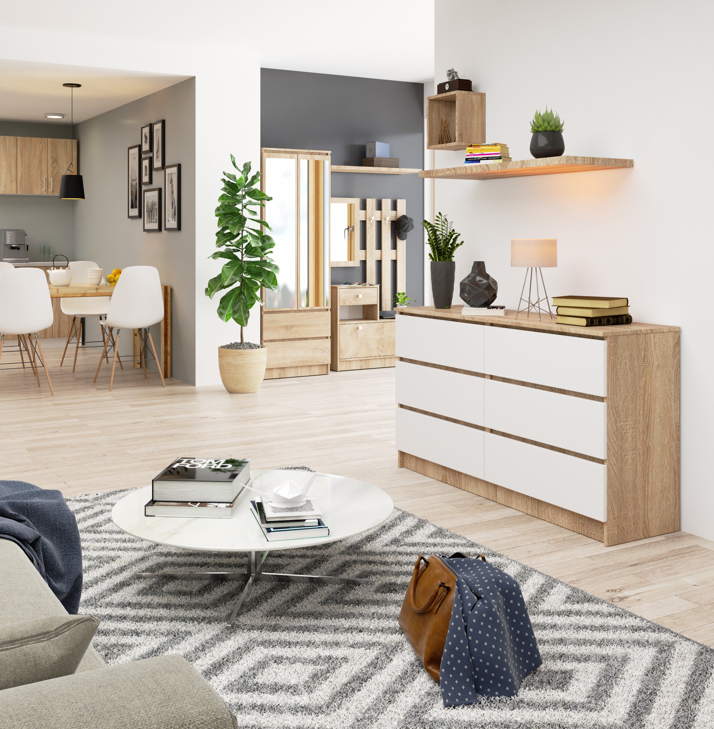Duża komoda wyposażona w sześć szuflad to interesująca propozycja stworzona w oparciu o potrzeby oraz oczekiwania klientów śledzących najnowsze trendy aranżacyjne, preferujących jasne, łatwe w utrzymaniu czystości i przede wszystkim funkcjonalne meble. Komoda K140 to połączenie dwóch bardzo modnych kolorów – bieli oraz dębu sonoma. Mebel z powodzeniem może zostać wykorzystany w pokoju dziennym, a także młodzieżowym lub gościnnym. Sprawdzi się też w sypialni, jadalni bądź biurze.