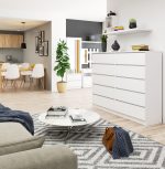 Komoda została wyposażona w dziesięć pojemnych szuflad, które są w stanie pomieścić wszelkie niezbędne artykuły. Uniwersalny i ponadczasowy kolor biały pozwala na łączenie komody z różnego rodzaju meblami o zróżnicowanej kolorystyce. Produkt został wykonany z płyty laminowanej o grubości 16 milimetrów odpornej na ścieranie. Krawędzie zostały oklejone obrzeżem ABS.