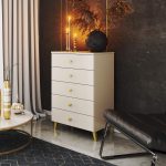 Niewielka komoda to element wyposażenia, który znajdzie zastosowanie w każdym pomieszczeniu. Nowoczesne barwy, solidna konstrukcja i staranne wykonanie zaowocowało powstaniem szafki, która sprawdzi się na przykład w przedpokoju, pokoju dziennym czy młodzieżowym, a także w sypialni. Może być wykorzystana również w pomieszczeniu biurowym, gdzie umożliwi przechowywanie licznych dokumentów oraz innych artykułów o charakterze biurowym. Komoda składa się z 5 szuflad. Mebel łączy w sobie kolorystykę kaszmir i złoty.