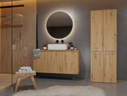 Chcąc, aby nasza łazienka była urządzona komfortowo, a zarazem stylowo, powinniśmy postawić na solidnie oraz funkcjonalnie wykonane meble. Takim z pewnością jest szafka nad pralkę. To idealny sposób na zagospodarowanie miejsca nad pralką, które zazwyczaj pozostaje niewykorzystane. Optymalne wymiary tego słupka sprawiają też, że jest świetnym rozwiązaniem do łazienek o małym metrażu. Ergonomiczny kształt umożliwia jego wykorzystania w każdym pomieszczeniu. Mebel ten składający się z nadstawki nad pralkę i znajdującej się nad nimi szafki tworzy sporą ilość miejsca do przechowywania różnego typu przedmiotów. W szafce schowamy artykuły takie jak detergenty czy środki higieniczne. Półki te są stworzone do przechowywania osobistych kosmetyków lub ręczników. Piękny odcień jakim jest dąb sonoma gwarantuje nam elegancki wystrój łazienki. Płyta laminowana, z której została wykonana ta szafka, to wysokogatunkowe tworzywo. Zapewnia ono trwałość i solidność mebla, a także zachowanie jego estetycznego wyglądu.