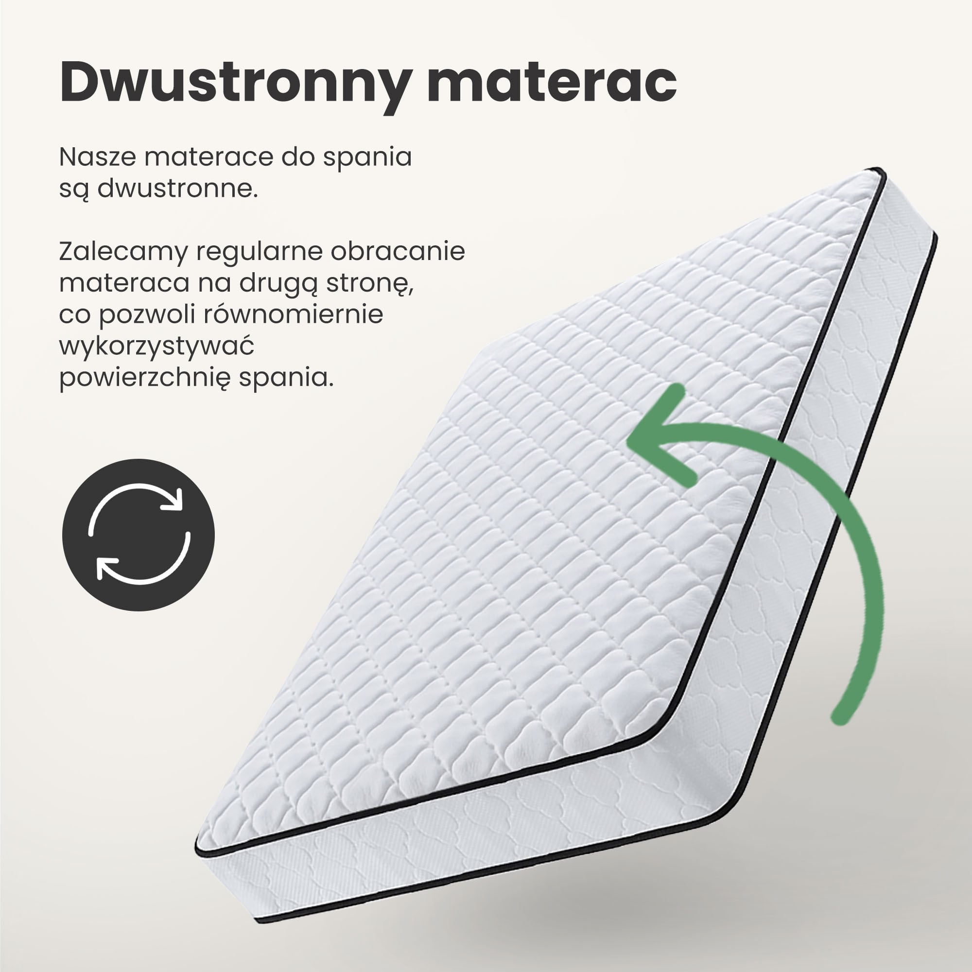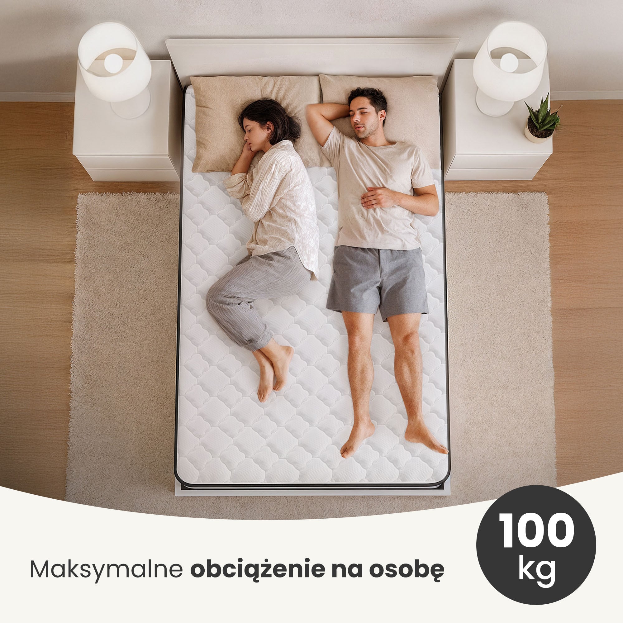 Materac sprężynowy o średniej twardości – H3 – dopasowuje się do kształtu pleców, zapewniając użytkownikom wysoki poziom komfortu podczas snu. Materac jest sprężysty, dobrze izoluje od podłoża i zapewnia odpowiednią cyrkulację powietrza. Optymalne maksymalne obciążenie na osobę to 100 kg.
