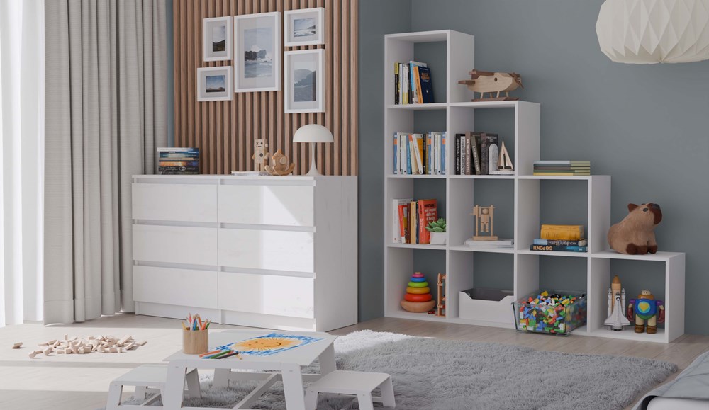 Pojemny regał pozwoli Ci na uporządkowanie przedmiotów w sypialni lub pokoju dziennym.
