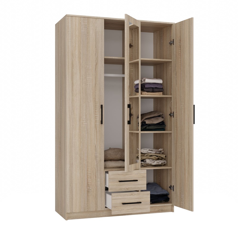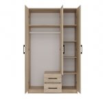 - 3-drzwiowa konstrukcja z podziałem na funkcjonalne strefy: przestrzeń na wieszaki, pojemne półki oraz praktyczne szuflady.