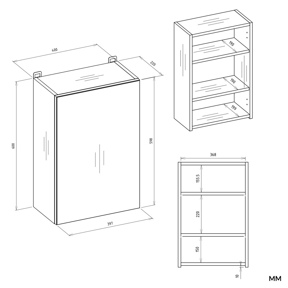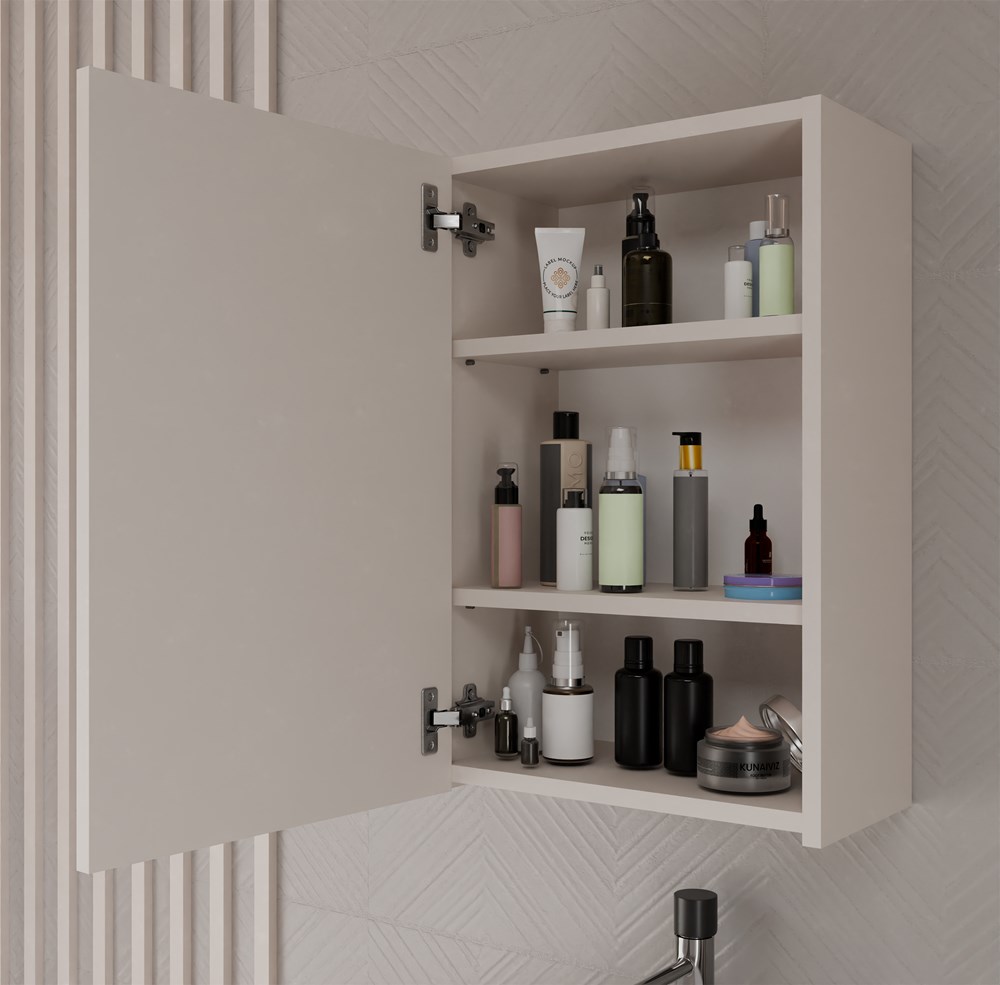- Wyposażona w 3 praktyczne półki schowane za stylowymi drzwiczkami z lustrzanym frontem.