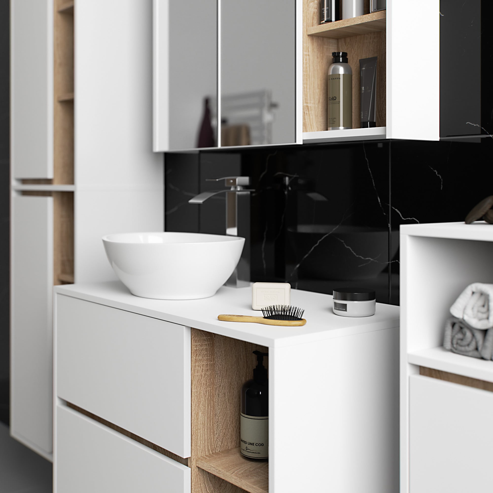 Szafki łazienkowe świetnie uzupełniają wyposażenie łazienki, zapewniając niezbędne miejsce na wszelkie kosmetyki i detergenty oraz nadając łazience określony styl. Pojemne szafki ułatwiają zachowanie porządku w pomieszczeniu, co korzystnie wpływa na estetykę wnętrza. Kolekcja VAMI wyróżnia się przykuwającą uwagę stylową kolorystyką – korpus oraz fronty mają taką samą barwę, natomiast kolor wewnętrzny jest inny.