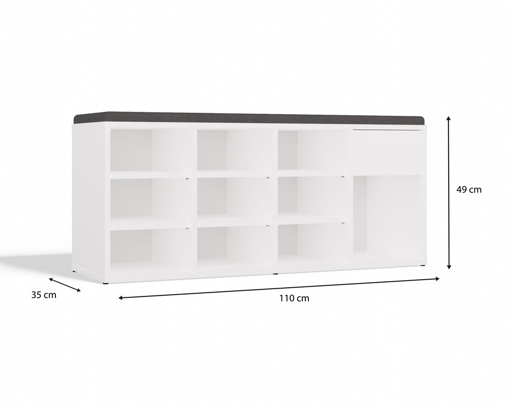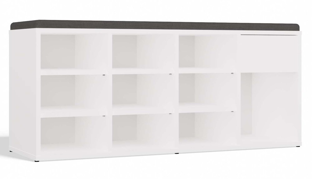 Szafka na buty TALLIN to funkcjonalne i estetyczne rozwiązanie do każdego przedpokoju, które łączy komfort siedzenia z dużą ilością miejsca do przechowywania. Biała bryła o lekkim, nowoczesnym wyglądzie została wzbogacona o tapicerowane siedzisko, zapewniając wygodę podczas zakładania obuwia. Mebel wyposażony został w aż 9 otwartych przegród na buty, szufladę na drobiazgi oraz wysoką komorę, w której z łatwością zmieścisz wyższe obuwie lub akcesoria.