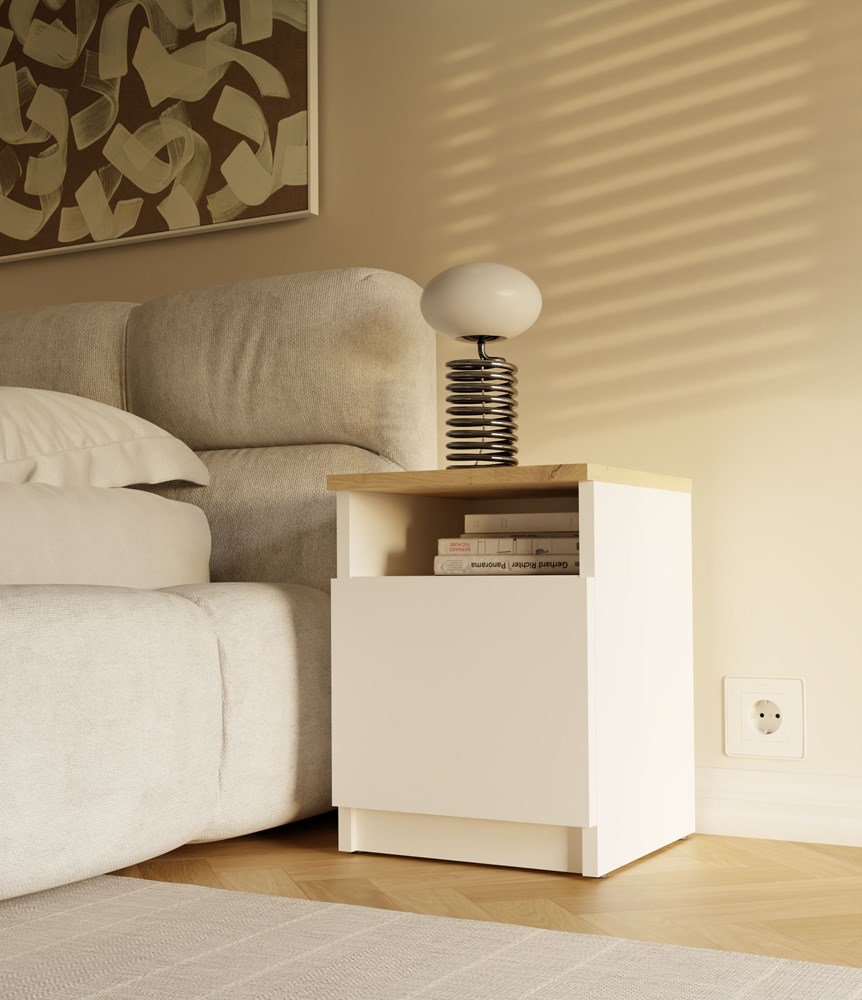 Szafka nocna GALAX 30 1D to praktyczne i estetyczne uzupełnienie każdej sypialni. Wyposażona w otwartą półkę oraz zamkniętą przestrzeń za drzwiami, doskonale sprawdzi się jako miejsce na książkę, telefon, ładowarkę czy inne przedmioty, które warto mieć zawsze pod ręką.