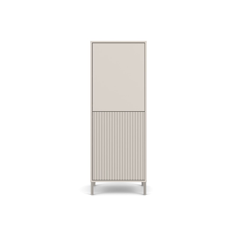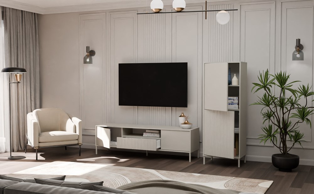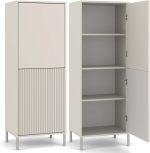 Witryna KAMARO 2DK SLIM/GŁADKI KASZMIR to połączenie estetyki i funkcjonalności, które doskonale odnajdzie się w salonie, pokoju gościnnym, sypialni czy gabinecie. Połączenie drzwi z gładkim frontem oraz drzwi z ryflowanym frontem przypominającym lamele dodaje charakteru, a system TIP-ON pozwala na wygodne użytkowanie bez uchwytów. Mebel zapewnia sporo miejsca do przechowywania, jednocześnie stanowiąc stylowy akcent w nowoczesnym wnętrzu.