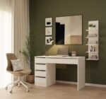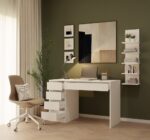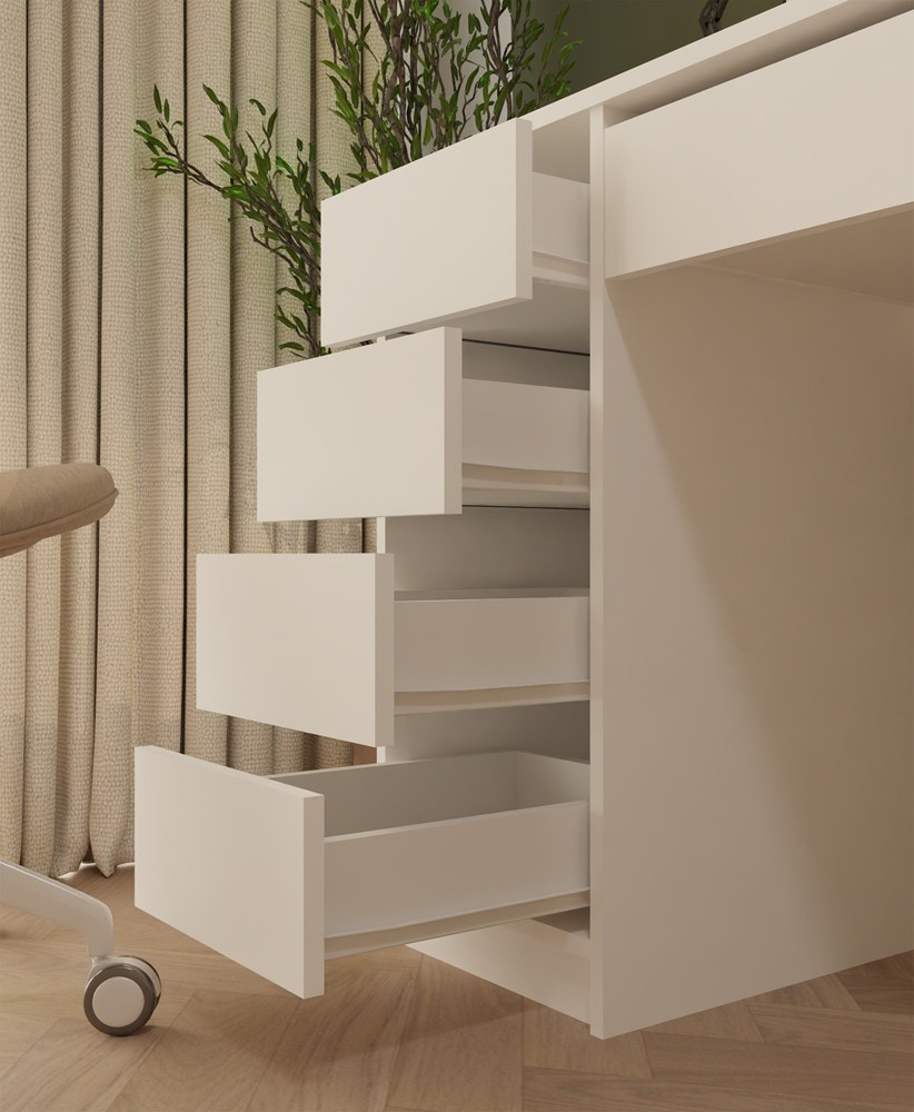Boczne szuflady pomagają uporządkować drobiazgi i dokumenty, a szeroka szuflada pod blatem to świetne miejsce na rzeczy, które chcesz mieć zawsze pod ręką – ale nie na widoku. Efekt? Czysty blat i pełna koncentracja.
