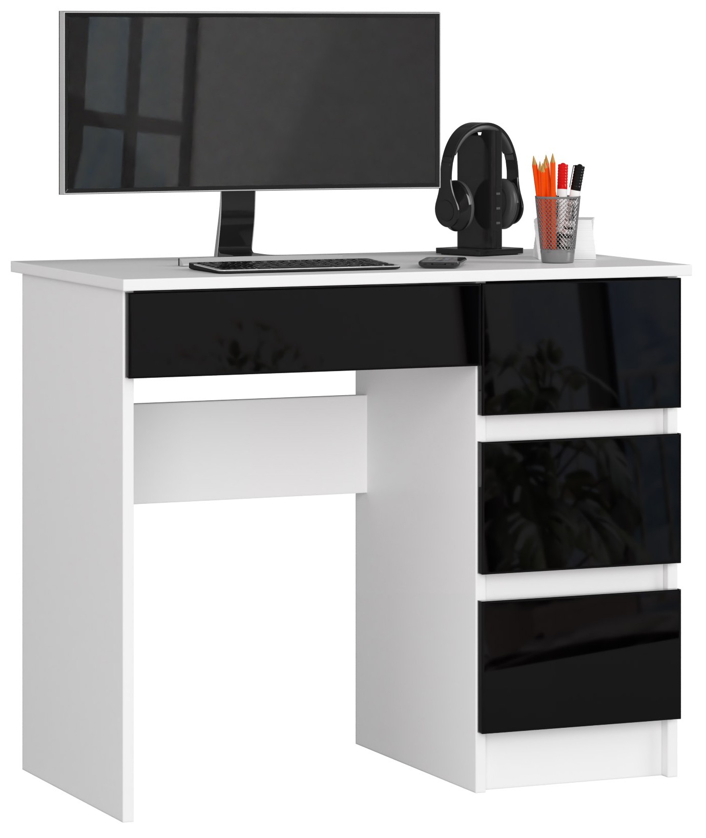 Czerń i biel to dwa ponadczasowe kolory, które doskonale łączą się zarówno ze sobą nawzajem, jak i z wszelkimi innymi barwami. Właśnie dlatego niezmiennie od lat są wykorzystywane w wielu aranżacjach wnętrz. Szczególnie dobrze pasują do pokojów młodzieżowych. Prezentowany model A-7 90 cm. (prawe) to biurko niewielkich rozmiarów, które stanowi połączenie białego korpusu oraz czarnych frontów w wysokim połysku. Interesująca kompozycja na pewno przypadnie do gustu miłośnikom minimalizmu, uniwersalnej kolorystyki i prostych brył.