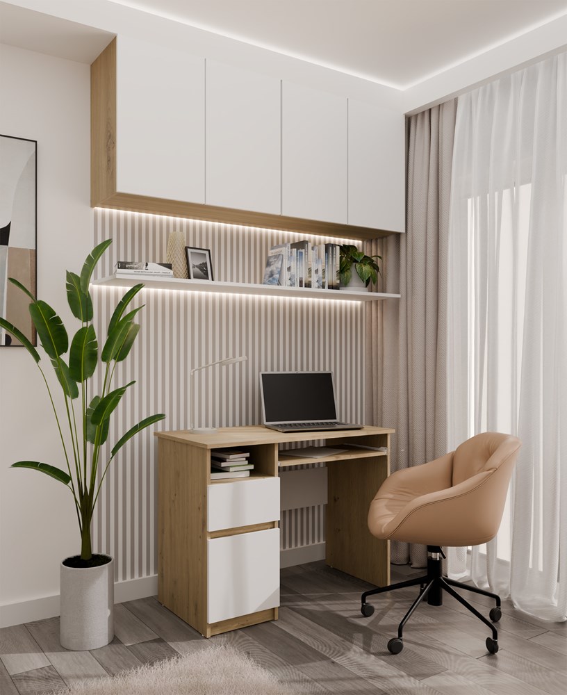 - Nowoczesny mix kolorów – biały i dąb artisan