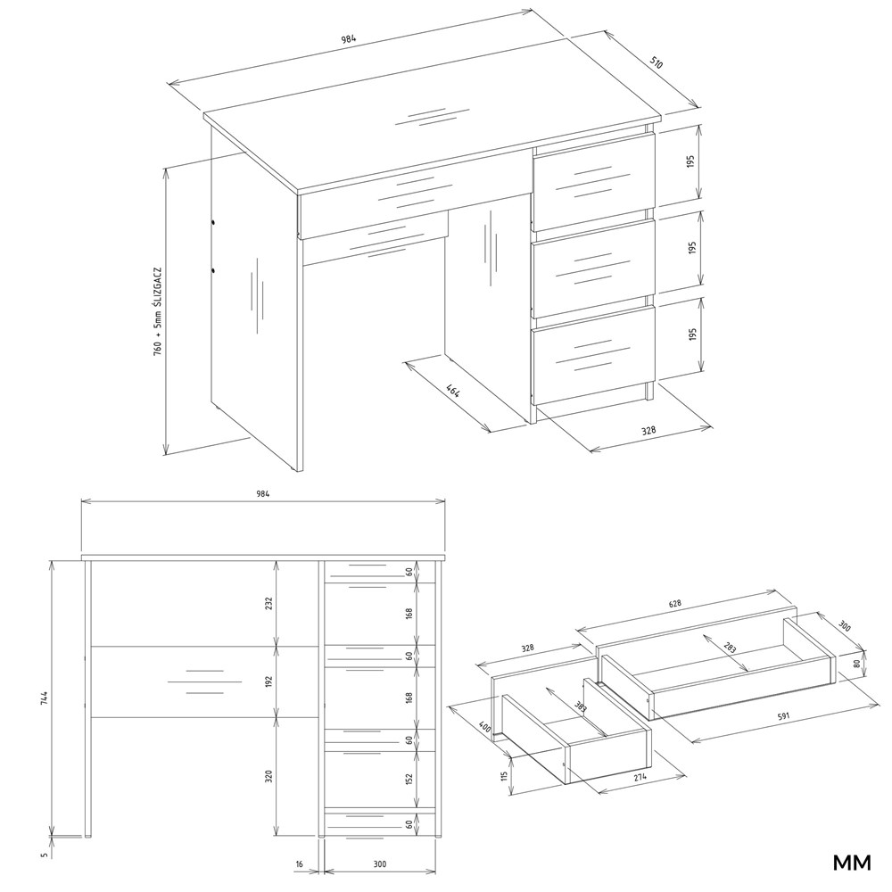 - 1 niska szuflada po lewej stronie pod blatem – na drobiazgi i najpotrzebniejsze akcesoria