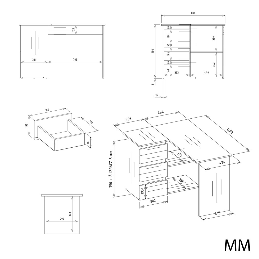Biurko wyposażono w pojemne szuflady oraz otwarte półki, które ułatwiają organizację dokumentów i akcesoriów. Duży blat roboczy daje komfortową przestrzeń na komputer i codzienne zadania, a narożna konstrukcja pozwala maksymalnie wykorzystać dostępne miejsce.