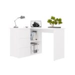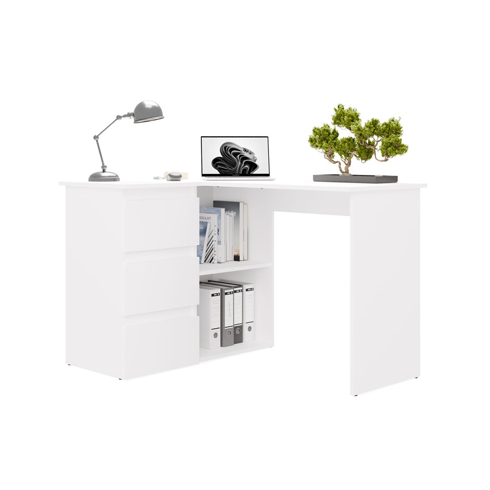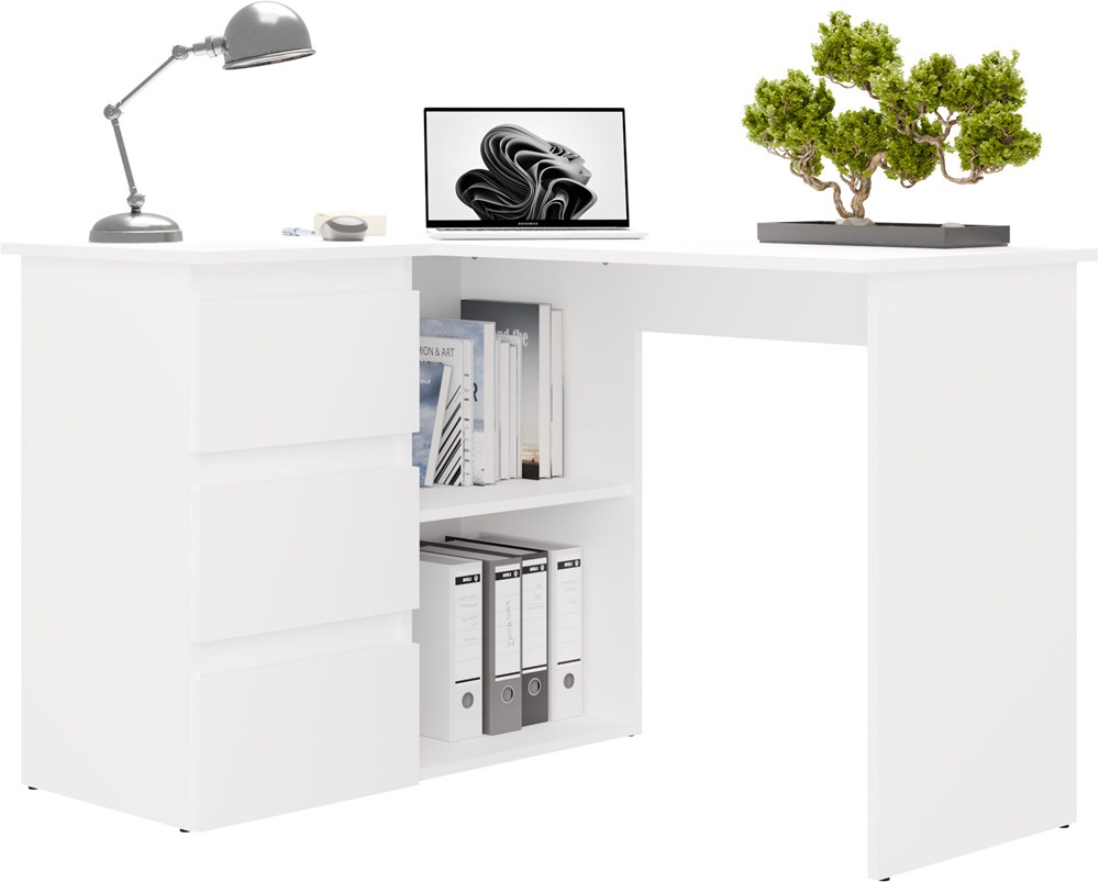 Biurko wyposażono w pojemne szuflady oraz otwarte półki, które ułatwiają organizację dokumentów i akcesoriów. Duży blat roboczy daje komfortową przestrzeń na komputer i codzienne zadania, a narożna konstrukcja pozwala maksymalnie wykorzystać dostępne miejsce.