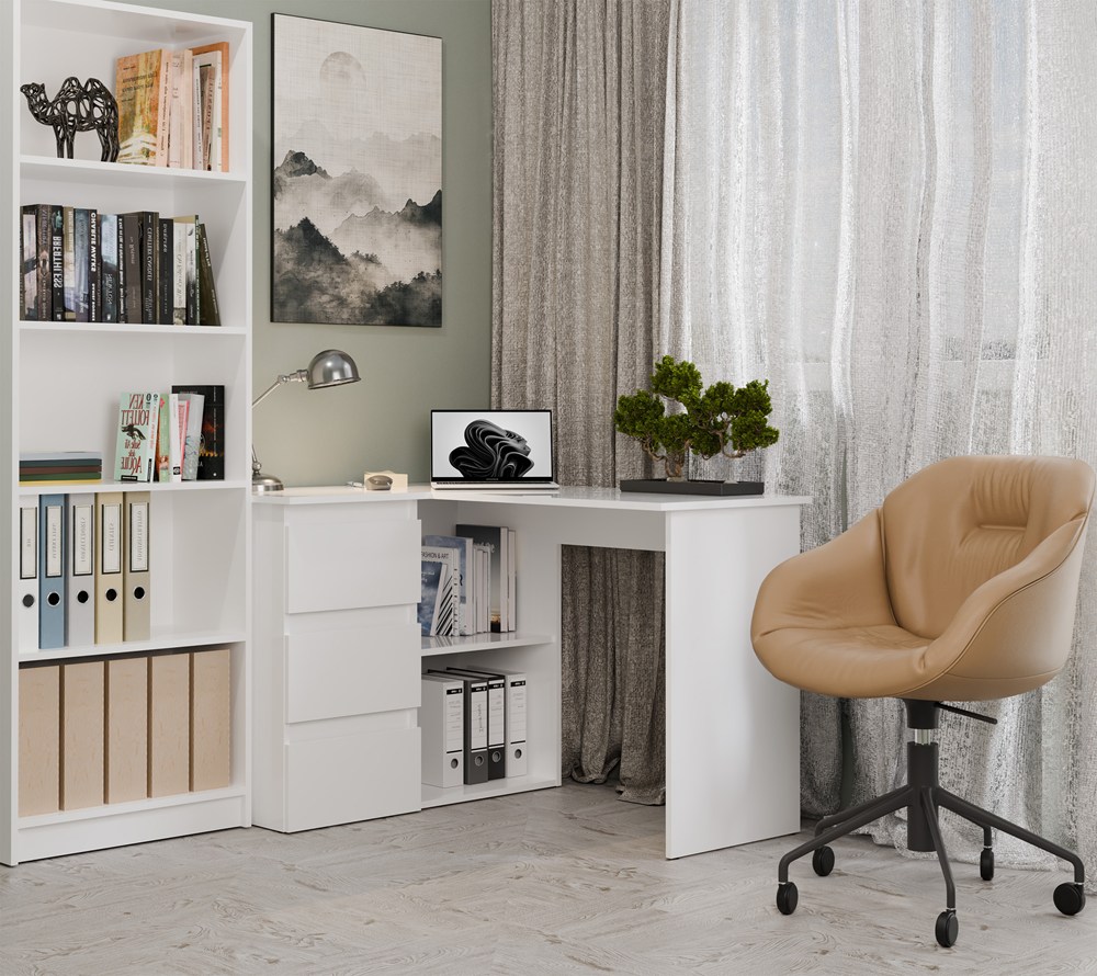 Nowoczesne biurko narożne w kolorze białym to idealne rozwiązanie do pracy i nauki w domowym biurze. Minimalistyczna forma świetnie wpisuje się w różne aranżacje, a przemyślany układ zapewnia wygodę użytkowania.