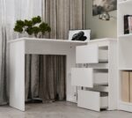 Nowoczesne biurko narożne w kolorze białym to idealne rozwiązanie do pracy i nauki w domowym biurze. Minimalistyczna forma świetnie wpisuje się w różne aranżacje, a przemyślany układ zapewnia wygodę użytkowania.