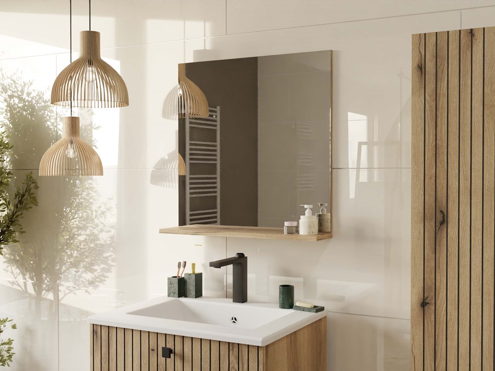 LUSTRO ŁAZIENKOWE Z PÓŁKĄ TIGO 60×61,5 CM DĄB EVOKE DO ŁAZIENKI PRZEDPOKOJU
