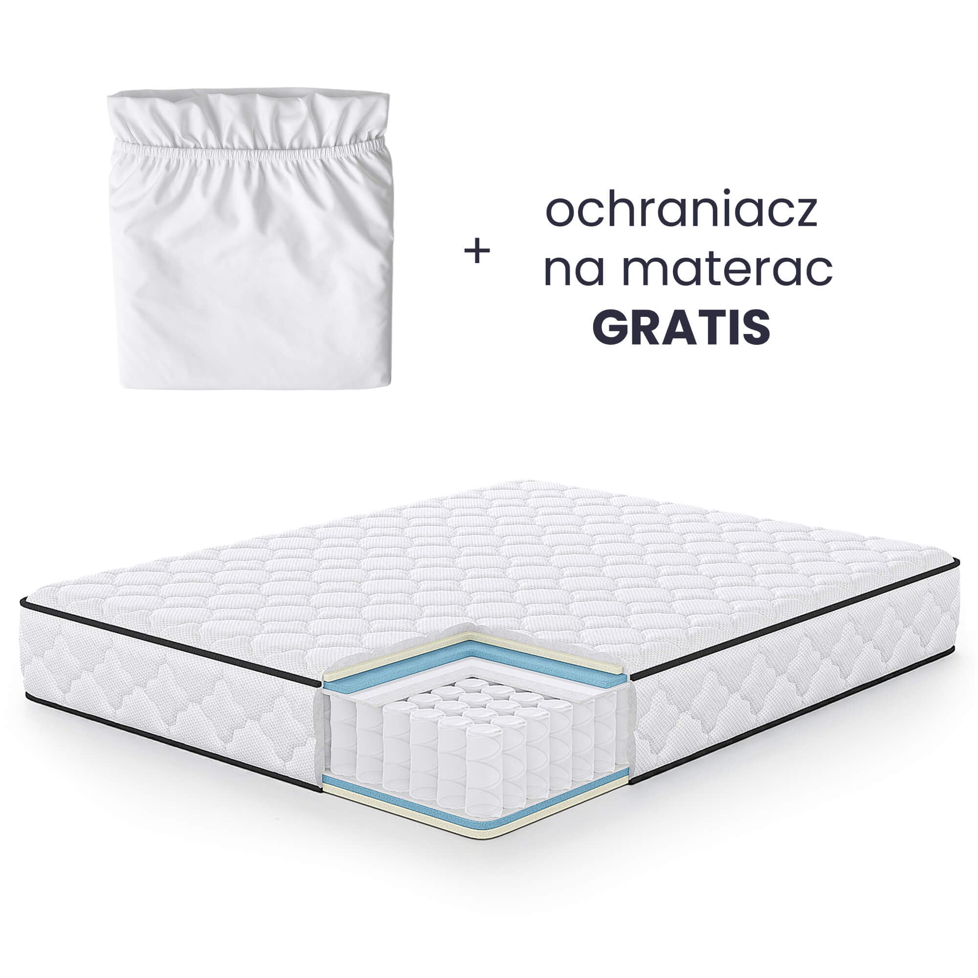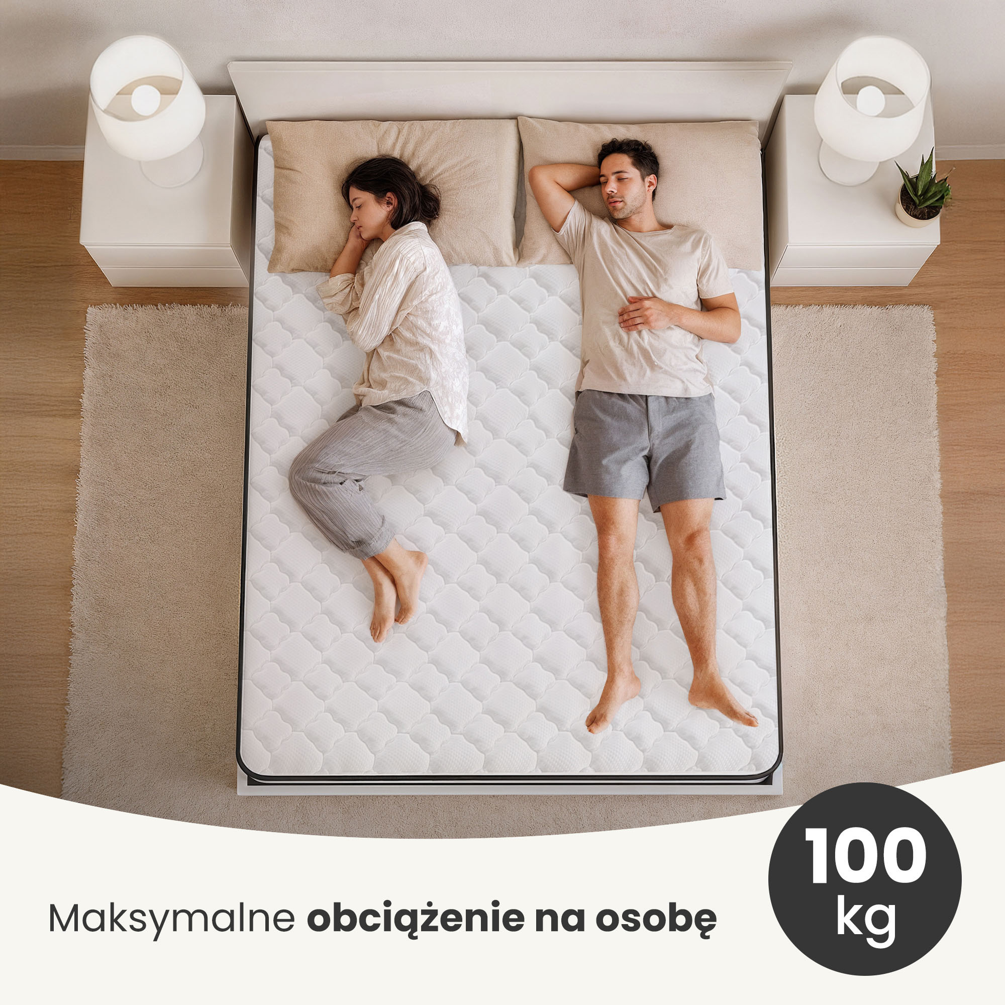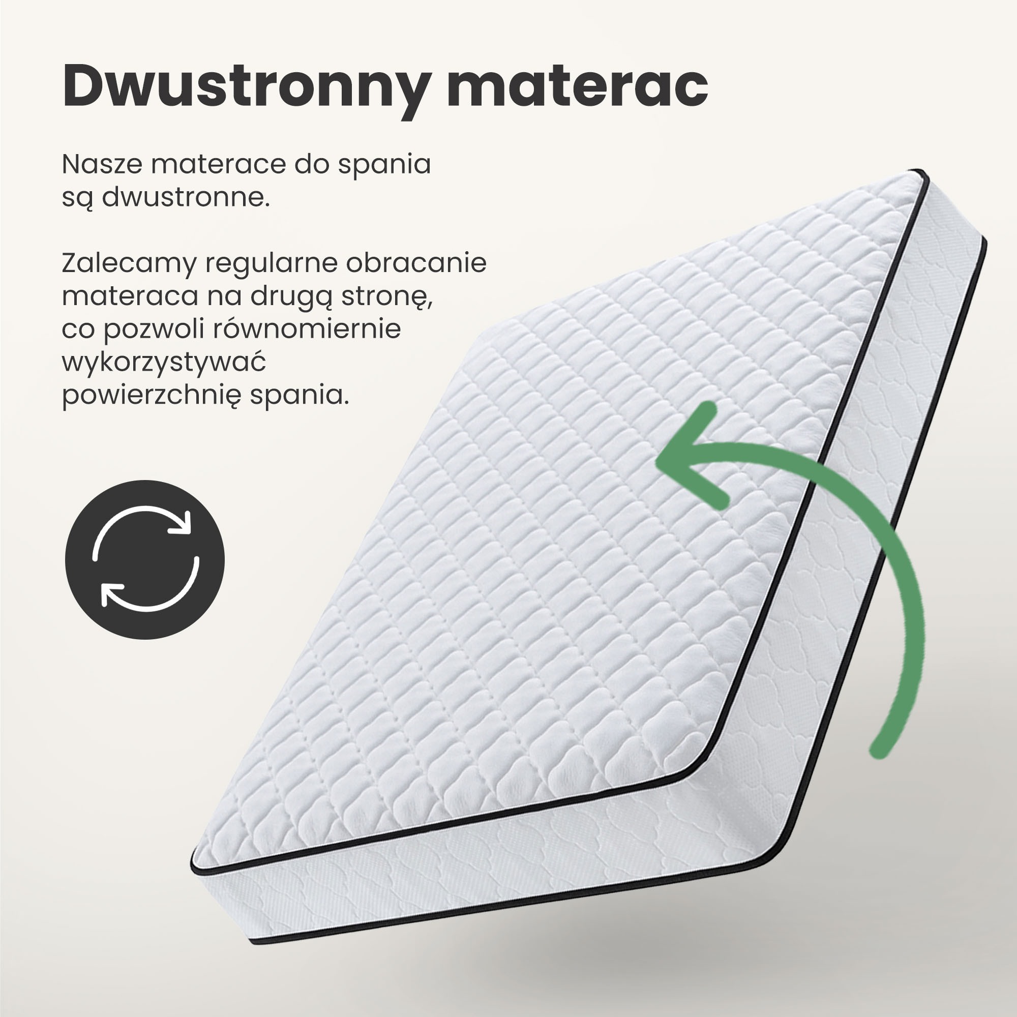 Materac sprężynowy o średniej twardości – H3 – dopasowuje się do kształtu pleców, zapewniając użytkownikom wysoki poziom komfortu podczas snu. Materac jest sprężysty, dobrze izoluje od podłoża i zapewnia odpowiednią cyrkulację powietrza. Optymalne maksymalne obciążenie na osobę to 100 kg.