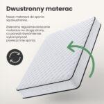 Materac sprężynowy o średniej twardości – H3 – dopasowuje się do kształtu pleców, zapewniając użytkownikom wysoki poziom komfortu podczas snu. Materac jest sprężysty, dobrze izoluje od podłoża i zapewnia odpowiednią cyrkulację powietrza. Optymalne maksymalne obciążenie na osobę to 100 kg.