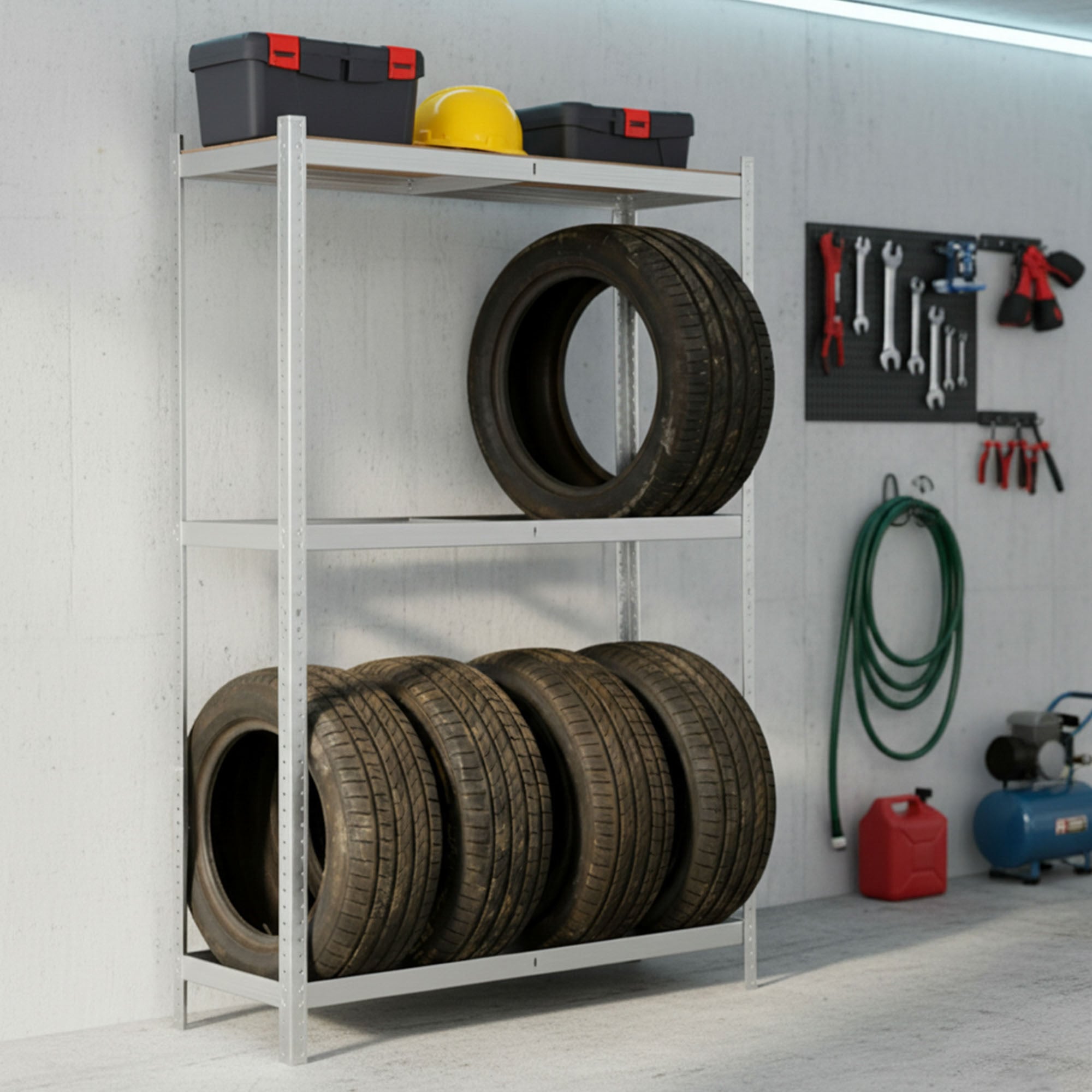 Metalowy regał garażowy na opony to solidna konstrukcja wykonana z wytrzymałej stali, zapewniająca stabilne i bezpieczne przechowywanie opon sezonowych. Pomaga utrzymać porządek w garażu oraz efektywnie wykorzystać dostępną przestrzeń. Model dostępny jest w kolorze czarnym oraz srebrnym, dzięki czemu łatwo dopasować go do każdego wnętrza.