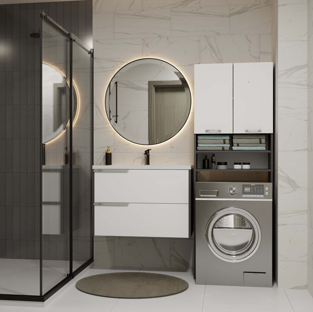 - 4 pojemne półki, w tym 2 schowane za drzwiami – idealne na ręczniki, detergenty i akcesoria.