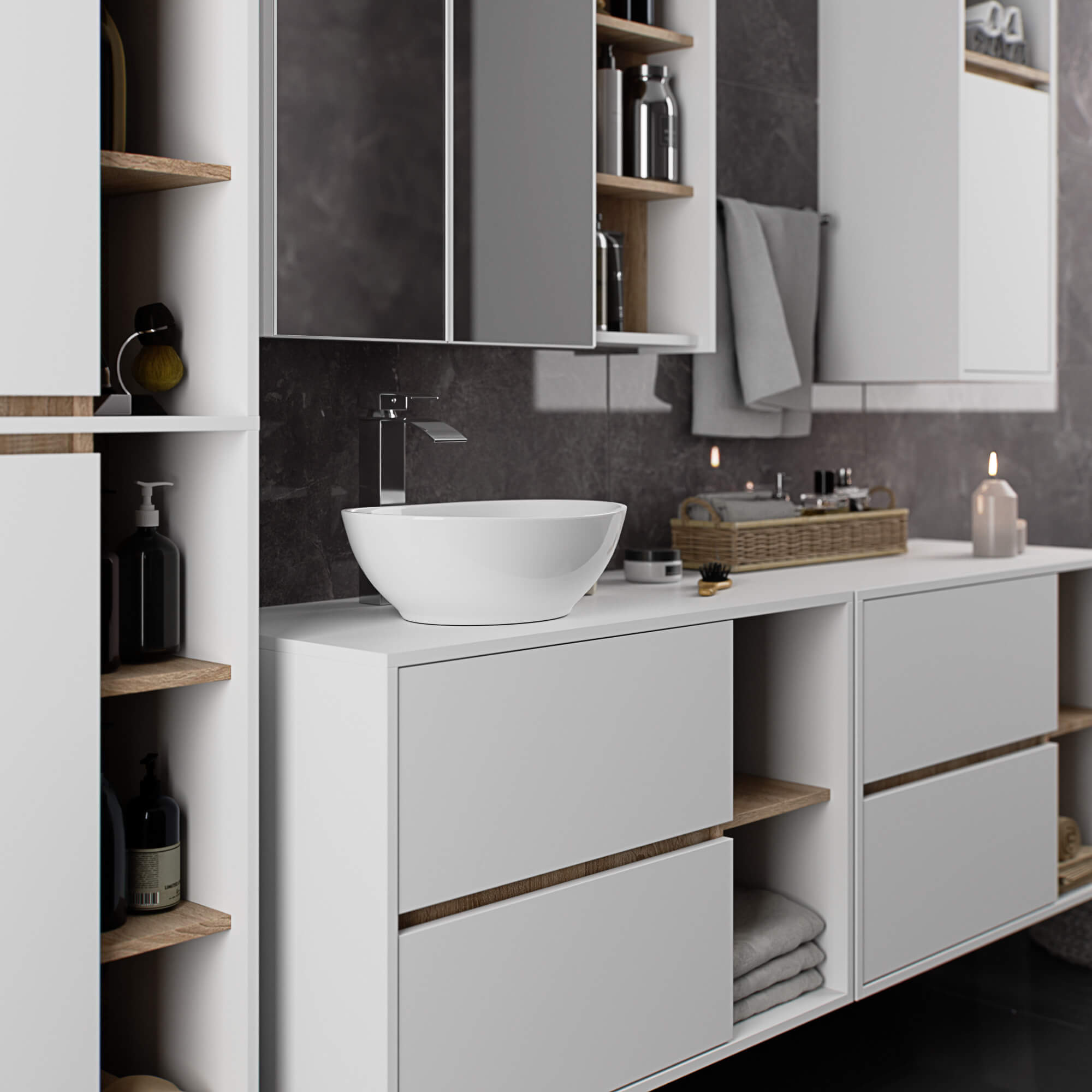 Szafka pod umywalkę nablatową VAMI W90 łączy w sobie nowoczesny design, lekką formę i dużą funkcjonalność. Dwie szuflady pozwalają wygodnie i estetycznie przechowywać artykuły higieniczne i nie tylko. Dodatkowym atutem szafki pod umywalkę nablatową VAMI W90 są dwie półki otwarte, które nadają jej atrakcyjny wygląd odpowiadający najnowszym trendom. Wymiary tego modelu to: szerokość 90 cm, wysokość 60 cm oraz głębokość 45,5 cm. Mebel jest przeznaczony do montażu na ścianie. Posiada specjalnie wyprofilowane szuflady umożliwiające zamontowanie syfonu i elementów hydraulicznych.