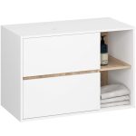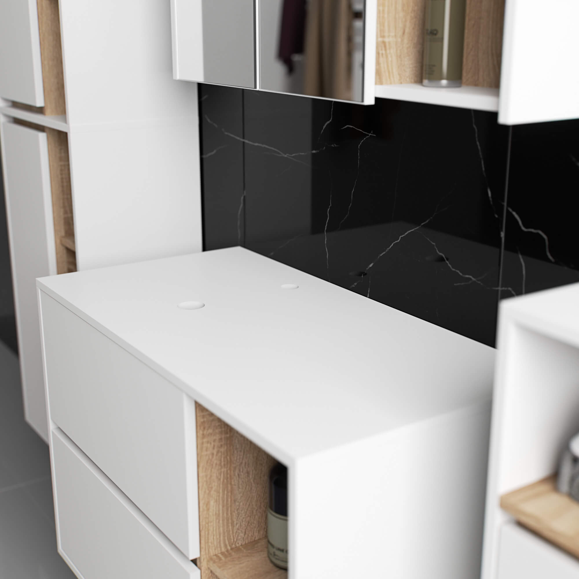 Szafka wisząca do łazienki pod umywalkę 90 cm VAMI W90 perfekcyjnie pasuje do nowoczesnego wystroju. Konfiguracja z 2 szufladami i 2 półkami otwartymi oferuje dużą wygodę użytkowania. W pojemnych szufladach można schować produkty higieniczne i kosmetyki, a na półkach otwartych położyć np. dekoracje, które pozwolą nadać wnętrzu bardziej osobisty charakter. Opisywany model szafki wiszącej pod umywalkę posiada w blacie 2 otwory przeznaczone do montażu umywalki oraz syfonu. Szafka ma także specjalnie wyprofilowane szuflady, które umożliwiają zamontowanie syfonu i elementów hydraulicznych. UWAGA! Mebel dostarczany jest bez umywalki i armatury.