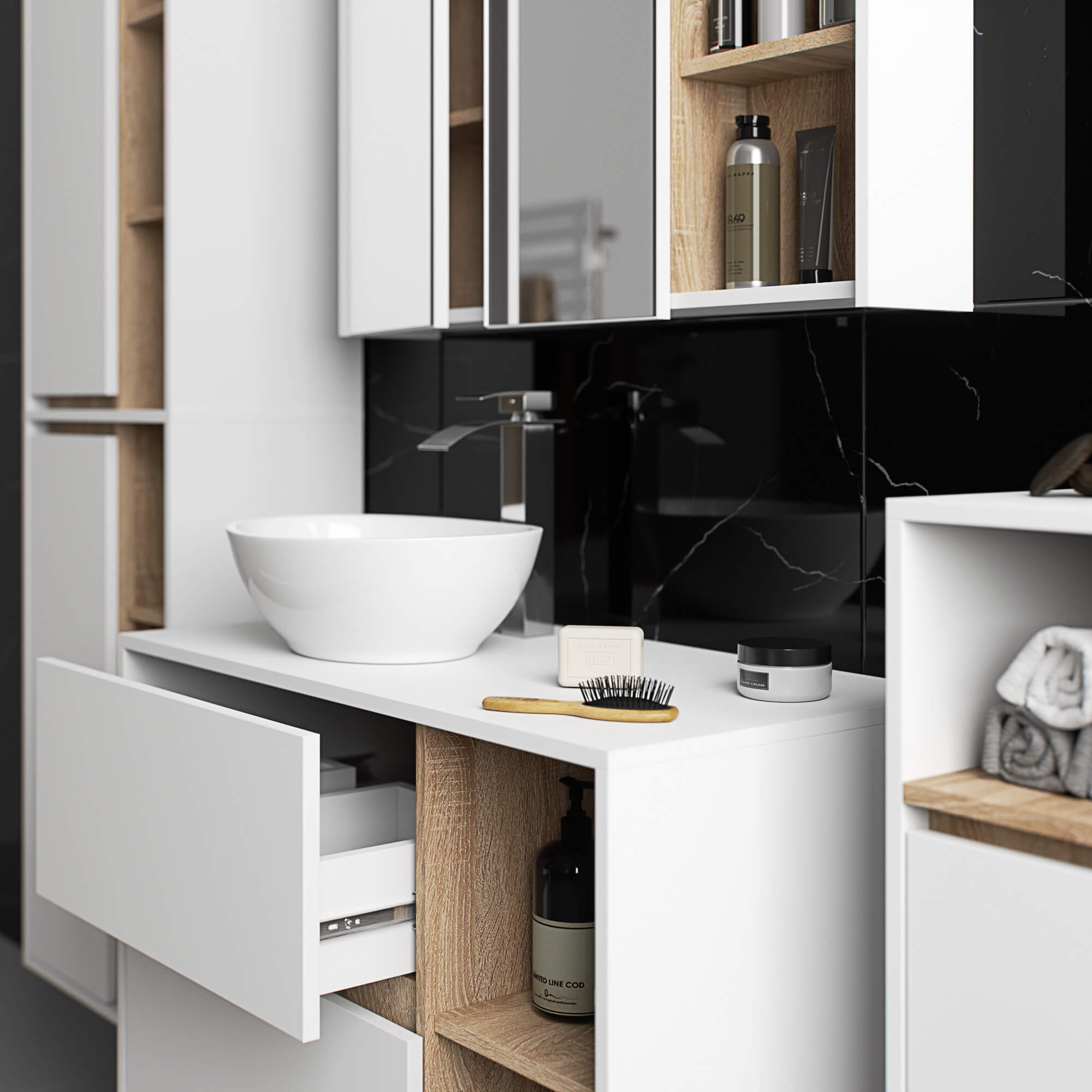 Szafki łazienkowe świetnie uzupełniają wyposażenie łazienki, zapewniając niezbędne miejsce na wszelkie kosmetyki i detergenty oraz nadając łazience określony styl. Pojemne szafki ułatwiają zachowanie porządku w pomieszczeniu, co korzystnie wpływa na estetykę wnętrza. Kolekcja VAMI wyróżnia się przykuwającą uwagę stylową kolorystyką – korpus oraz fronty mają taką samą barwę, natomiast kolor wewnętrzny jest inny.