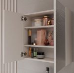 - Wyposażona w 3 praktyczne półki schowane za 2 stylowymi drzwiczkami z lustrzanym frontem.