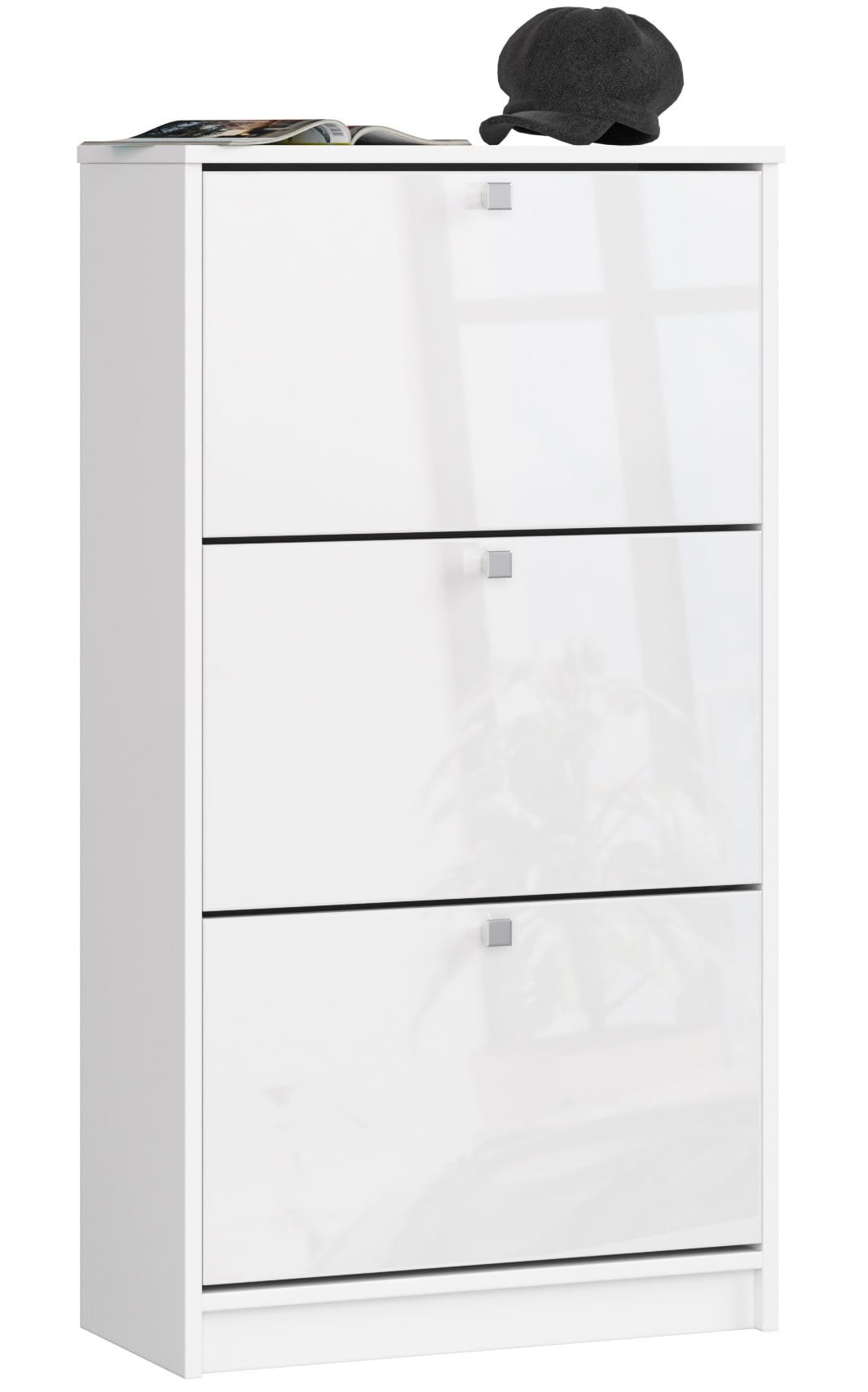 Biała szafka na buty posiada trzy szuflady z uchylnymi drzwiczkami i uchwytami w odcieniu satynowym. Mebel przeznaczony jest do przechowywania każdego rodzaju butów oraz akcesoriów do czyszczenia obuwia. Szafka pasuje zarówno do dużego, jak i niewielkiego przedpokoju. Prosty w formie i w uniwersalnym kolorze mebel skomponuje równie dobrze z aranżacją nowoczesną, jak i klasyczną, oraz ze ścianami w kolorze ciemniejszym i w zdecydowanie jasnym odcieniu. Szafka na buty będzie znakomitym rozwiązaniem do korytarza o małej powierzchni i niedoświetlonego, ponieważ biel wizualnie powiększa i rozświetla pomieszczenia. Korpus szafki został wykonany z płyty laminowanej, która jest odporna na ścieranie i zarysowania. Krawędzie mebla starannie wykończono wytrzymałą okleiną ABS. Do wykonania frontów szafki producent użył płyty MDF z trwałą powłoką akrylową o najwyższym standardzie połysku, dzięki czemu mebel prezentuje się wyjątkowo elegancko. Szafkę na buty łatwo można utrzymać w czystości, przecierając mebel suchą lub wilgotną ściereczką.