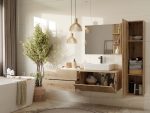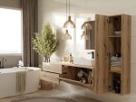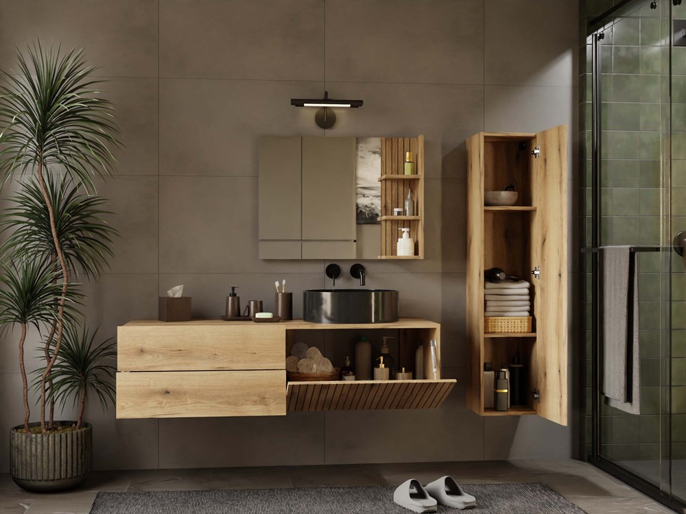 TIGO 1D2S to elegancka i funkcjonalna szafka łazienkowa, która zachwyca nowoczesnym designem i perfekcyjnym wykonaniem. Charakterystyczny front z pionowym frezowaniem (imitacja lameli) w ciepłym wybarwieniu Dąb Evoke nadaje meblowi stylowego i naturalnego charakteru.