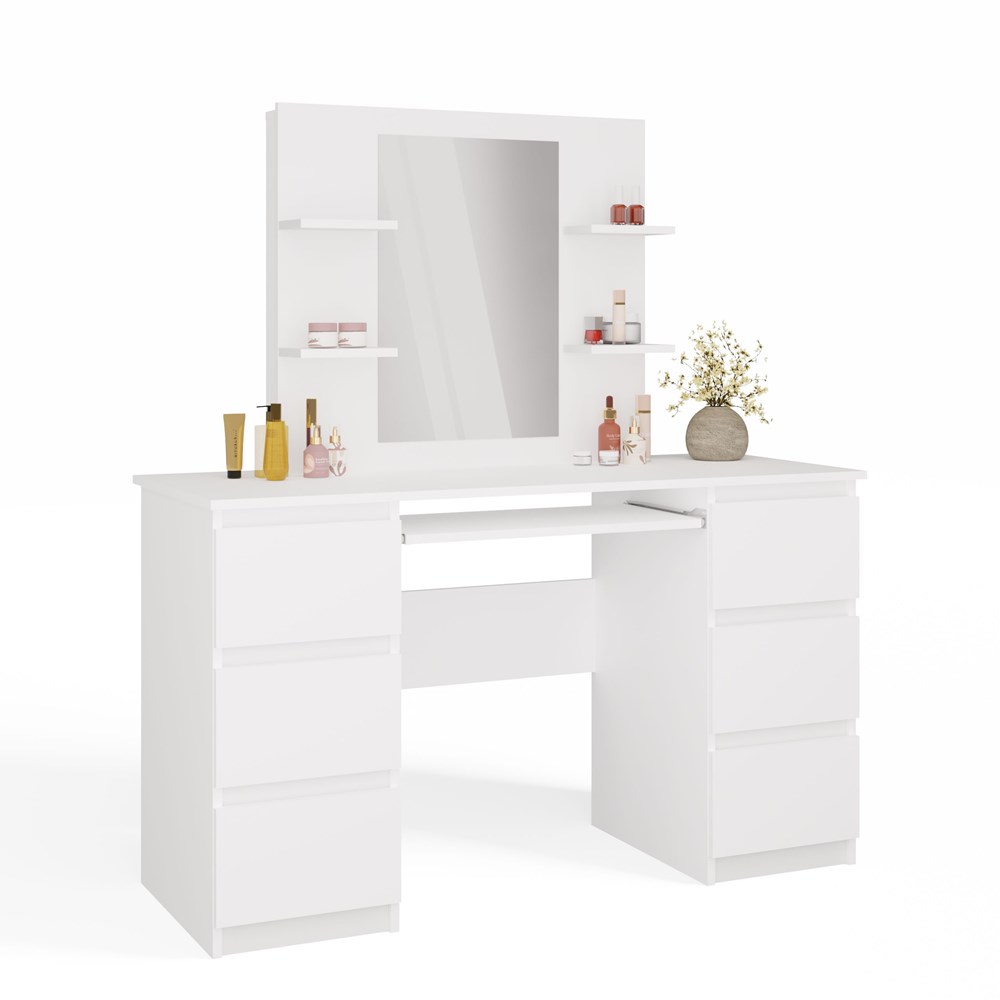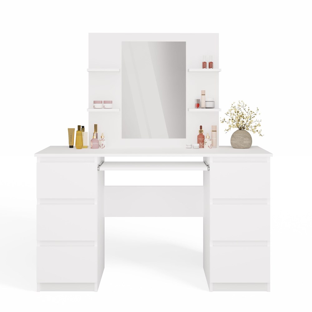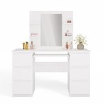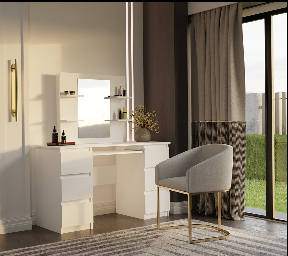 Toaletka z lustrem i 4 półkami to idealny mebel dla osób, które cenią sobie komfort oraz piękno swojego otoczenia. Przemyślana konstrukcja pozwala na wygodne przechowywanie kosmetyków i biżuterii, a także może funkcjonować jako praktyczne biurko.