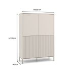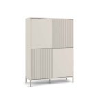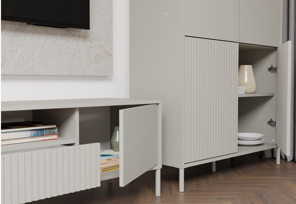 Witryna KAMARO 4DK to nowoczesny i funkcjonalny mebel, który świetnie sprawdzi się w salonie, pokoju gościnnym, sypialni czy gabinecie. Dzięki większej szerokości (103,5 cm), oferuje jeszcze więcej przestrzeni do przechowywania, zachowując elegancki i loftowy charakter. Połączenie drzwi z gładkim frontem oraz drzwi z ryflowanym wykończeniem dodaje stylowego kontrastu, a system TIP-ON umożliwia wygodne otwieranie bez uchwytów.