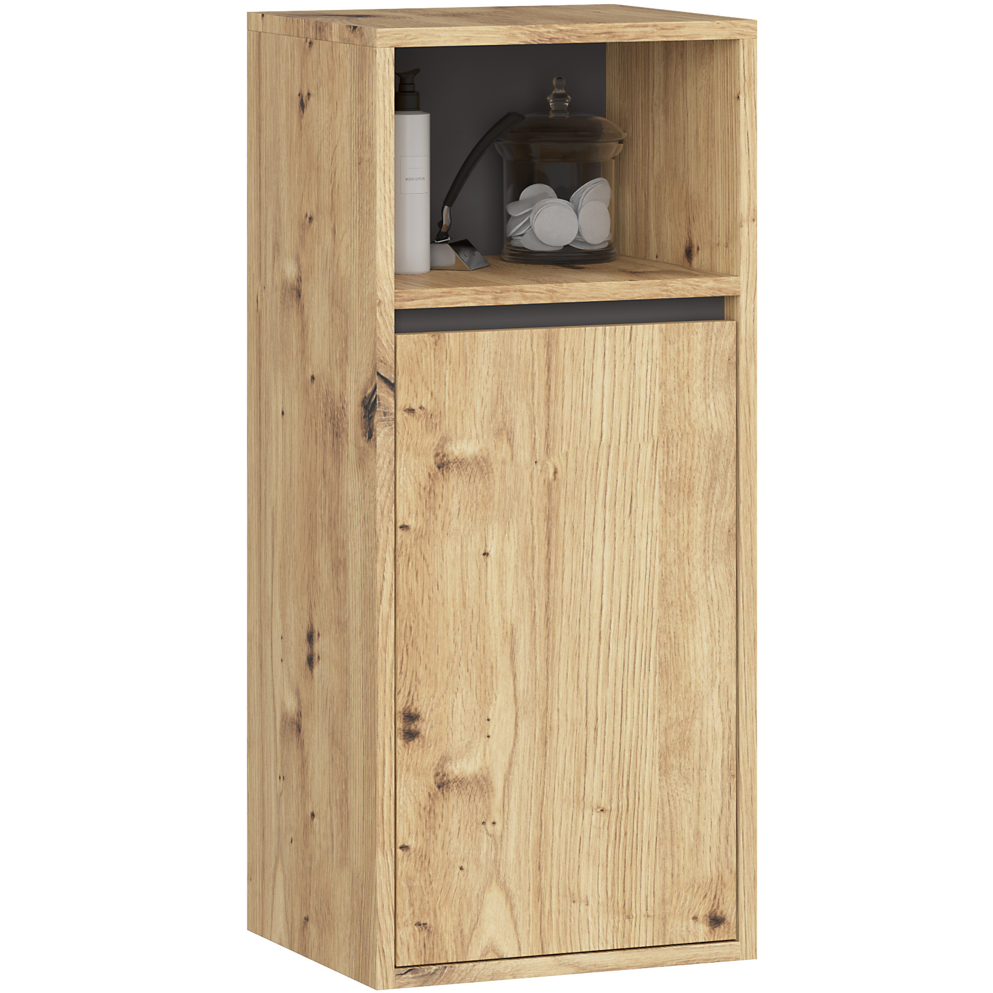 Zestaw mebli do łazienki VAMI z szafką pod umywalkę doskonale wpisuje się w aktualne trendy aranżacyjne. Ciekawy design z półkami otwartymi nadaje łazience przyjemny i stylowy wygląd. Wszystkie szafki wchodzące w skład zestawu są przeznaczone do montażu na ścianie. Zestaw został zaprojektowany tak, aby zapewnić odpowiednio dużo miejsca na kosmetyki, artykuły higieniczne i inne niezbędne w łazience produkty. Opisywany komplet mebli obejmuje: