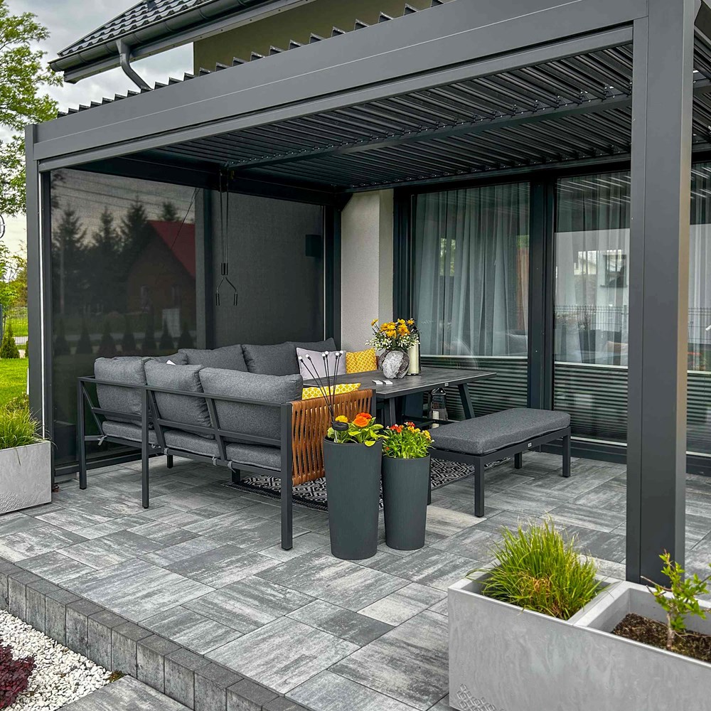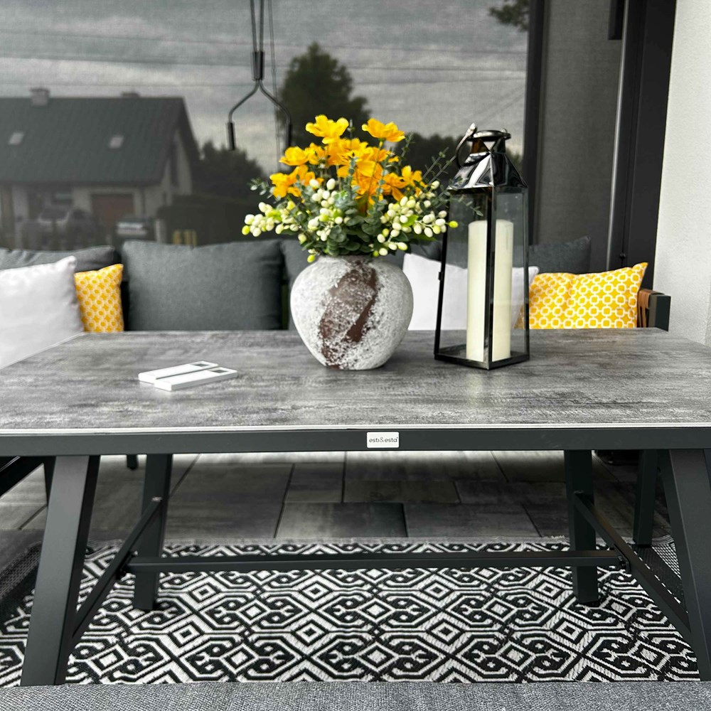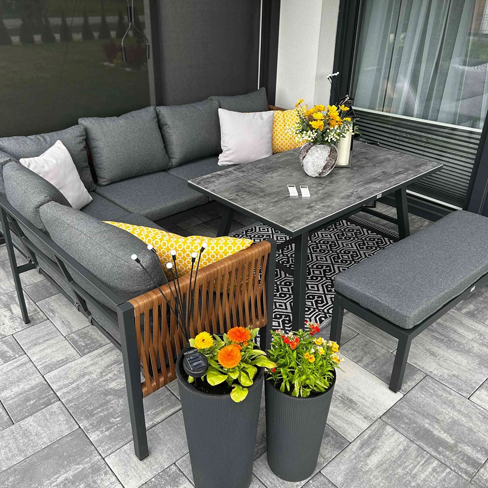 Styl, wygoda i trwałość – TEXAS to komplet mebli jadalnianych stworzony z myślą o wspólnych posiłkach na świeżym powietrzu. Duża narożna sofa, solidny stół z efektem kamiennego blatu oraz wygodna ławka tworzą zestaw idealny do altany, pergoli czy ogrodu. Dzięki ponadczasowej kolorystyce i eleganckim akcentom (pleciona boczna rama) zestaw świetnie komponuje się z roślinnością i nowoczesną architekturą.